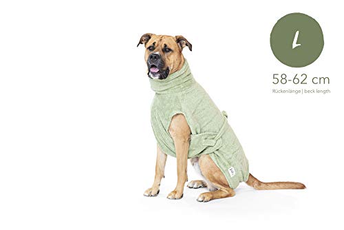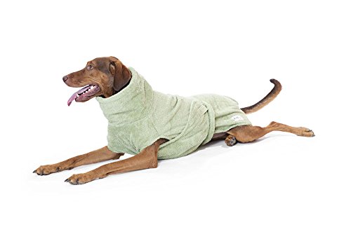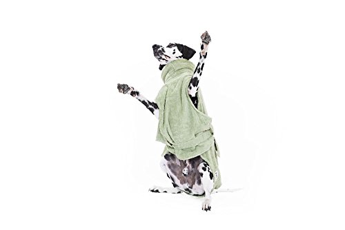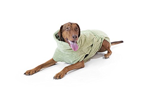 Der Hundebademantel ist aus einer umweltfreundlichen und kuschelweichen Bio-Baumwolle (GOTS* zertifiziert). Der besonders dicke Frotteestoff, ähnelt einem Saunahandtuch und nimmt Flüssigkeit sehr schnell auf. Er ist am Hals doppel-lagig und umschließt auch den Brust,- und Bauchbereich, wo sich beim Hund besonders viel Dreck und Nässe ansammelt. Da sich Hunde schütteln und sich gerne auf dem Teppich wälzen wenn sie nass sind, schützt der Hundebademantel, um den Wohnraum vor unschönen Spritzern an Möbeln, Fenstern und Türen zu schützen und der Hund trocknet schneller.