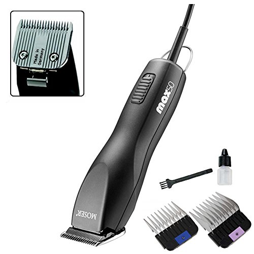 Moser MAX 50, stärker geht es nicht!Die MAX 50 ist wesentlich besser als die legändere MAX 45! Extra dabei 8 Metallaufsteckkämme Die Moser Max 50 eignet sich für die Vollschur kleiner + großer Tiere! Es ist die bislang kraftvollste und leiseste Moser Netz-Tierhaarschneidemaschine die es gibt! Die Maschine hat super kraftvollen „Exzenter Power Motor“, welcher die MAX 50 extrem leistungsstark macht! Die MAX 50 hat ein besonders ergonomisches und griffiges Design, und ist dabei spürbar leicht und laufruhig. Damit die Moser MAX 50 sicher in der Hand liegt, verfügt das Gerät über eine Anti-Rutsch Einlage! Max 50 hat eine Schnellwechsel-Drucktaste für einen leichten Austausch des Schneidsatzes, bzw. eine leichte Reinigung/Pflege des Schneidsatzes. Zubehör: Max 50 mit 1,0mm Edelstahl-Schneidsatz Reinigungsbürste Ölfläschchen 2 Metall-Aufsteckkämme 6 & 13 mm Technische Details: Typ: Professionelle Netz-Schermaschine Schneidsatz: Edelstahl-Wechselschneidsatz Wechselschneidsatz: • Schneidkammbreite: 49 mm Schnittlänge: 1 mm Betriebsart: Kabel Antrieb: Exzenter Power Motor Drehzahlregelung: • Betriebsspannung: 100-240 V / 50/60 Hz Kabel: 3 m professionelles Rundkabel Maße: 196 x 54 x 48 mm Gewicht: 360 g Dabei: 8 Metallaufsteckkämme + Box. Sie eignen sich sich besonders bei: Langhaarhunden dichtem / starkem Fell starker Unterwolle Farbleitsystem für einfache Erkennung der Kammgröße. Schnittlängen: 3, 6, 10, 13, 16, 19, 22, 25mm